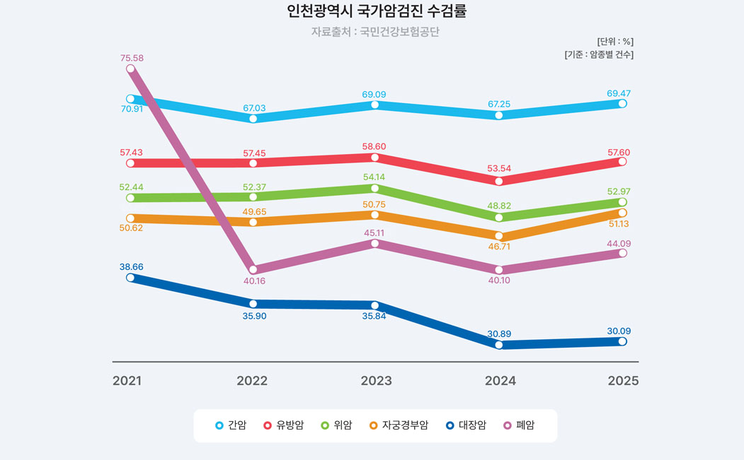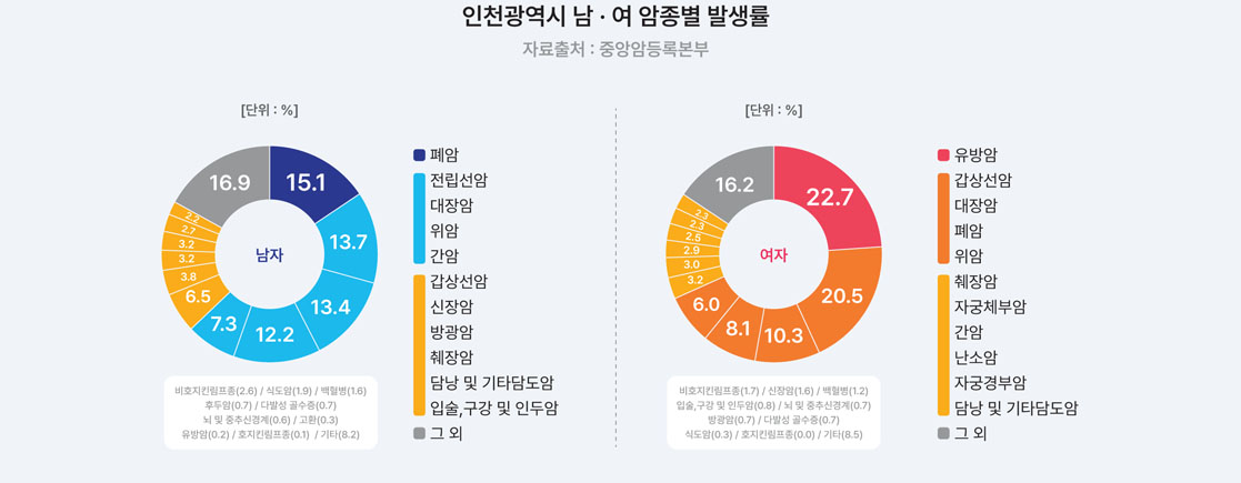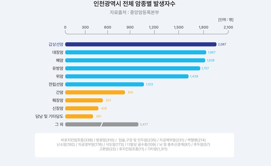 2024년 12월에 발표된 국가암등록사업연례보고서에 따르면 2022년 1월 1일부터 12월 31일까지 인천광역시 암 발생자 수는 282,047명으로 연령표준화 암 발생률은 인구 10만 명당 550.2명이었습니다. 남, 여 전체에서의 암종별 발생률은 갑상선암(66.2명), 대장암(64.7명), 폐암(63.0명), 유방암(57.6명), 위암(57.5명), 전립선암(40.5명), 간암(29.1명) 순이었습니다.