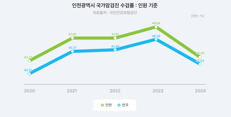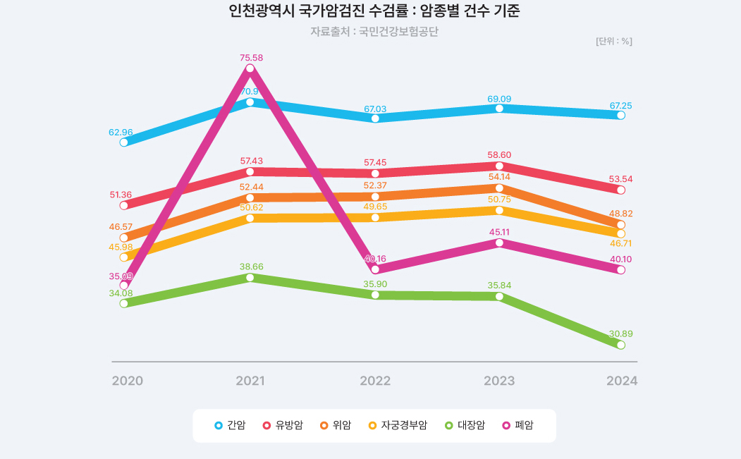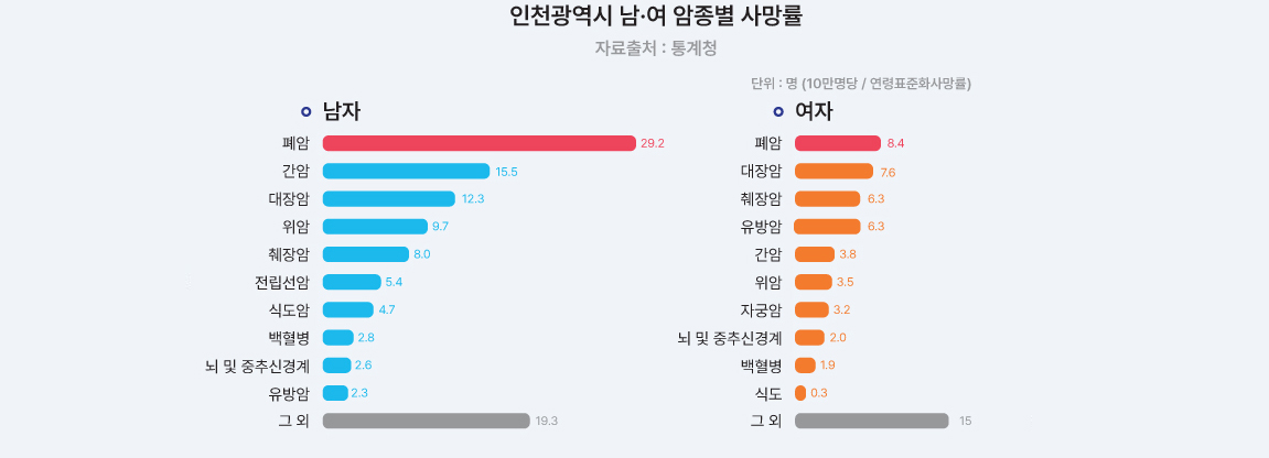 2024년 12월에 발표된 국가암등록사업연례보고서에 따르면 2022년 1월 1일부터 12월 31일까지 인천광역시 암 발생자 수는 282,047명으로 연령표준화 암 발생률은 인구 10만 명당 550.2명이었습니다. 남, 여 전체에서의 암종별 발생률은 갑상선암(66.2명), 대장암(64.7명), 폐암(63.0명), 유방암(57.6명), 위암(57.5명), 전립선암(40.5명), 간암(29.1명) 순이었습니다.