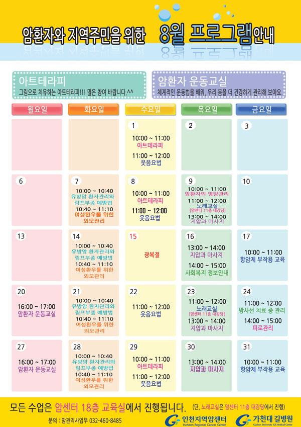 암환자와 가족을 위한 8월 건강강좌 일정 안내 페이지 정보 등록일 : 13-07-31 13:30 조회수 : 8,571회 관련링크 본문 암환자와 가족을 위한 8월 건강강좌 일정 안내입니다.많은 관심과 참여 부탁드립니다. 이전글 다음글 목록