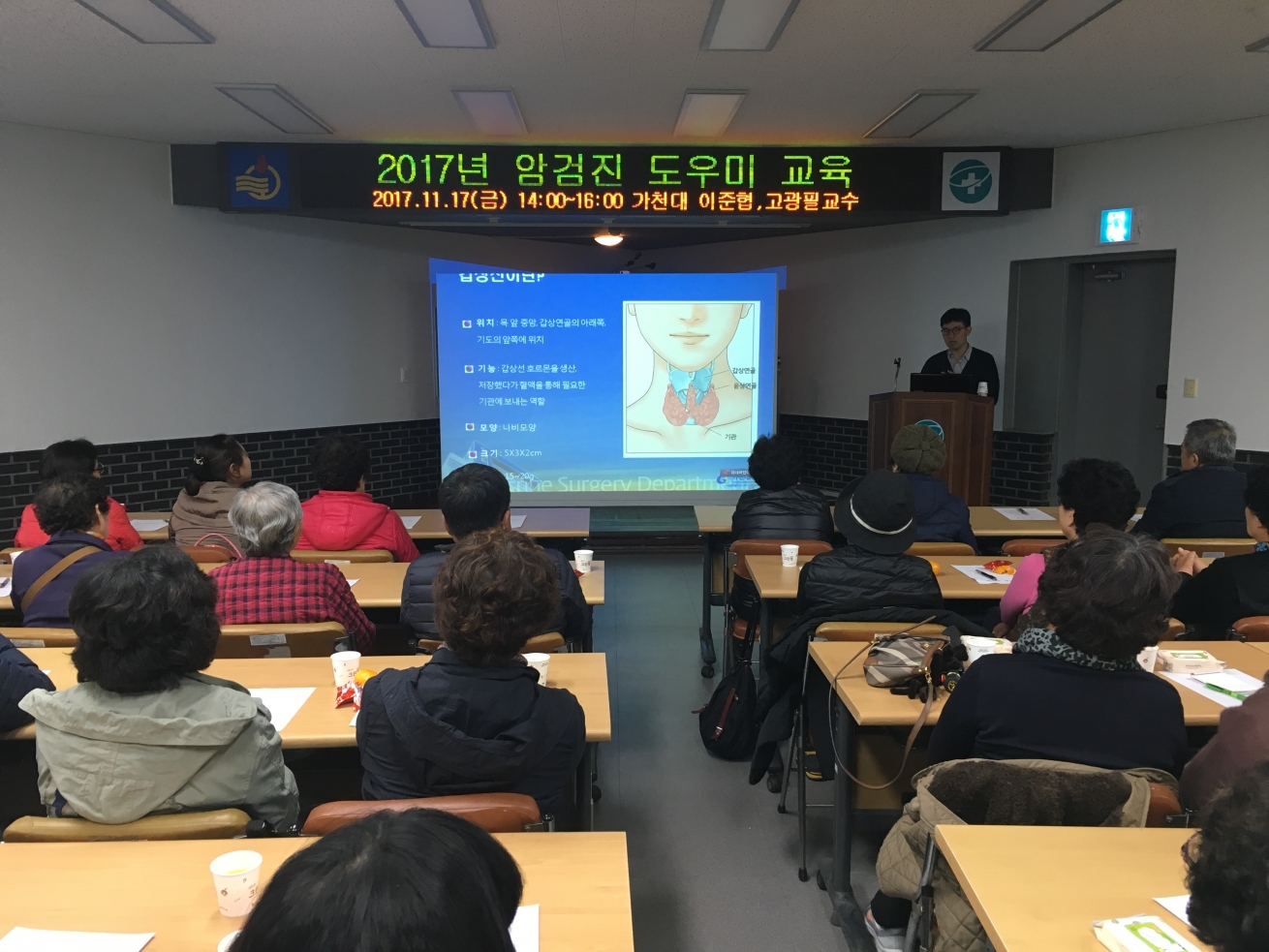 11. 17 (금) 강화군 보건소에서 강화군 암검진 도우미를 대상으로 가천대 길병원 갑상선클리닉 이준협 교수가 갑상선암 치료 및 예방관리 가천대학교 예방의학과 고광필 교수가 암예방 및 국가암검진에 대한 교육을 실시하였습니다.