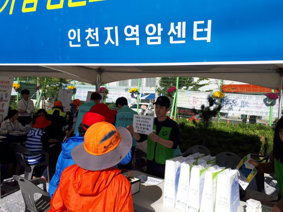 2017년 9월 20일(수) 옹진군에 위치한 영흥종합운동장 에서 지역주민 및 도서지역 주민들을 대상으로 옹진군보건소와 함께 09:00-15:00시까지 암예방 관리 및 국가암검진에 대해 홍보 캠페인을 실시하였습니다.
