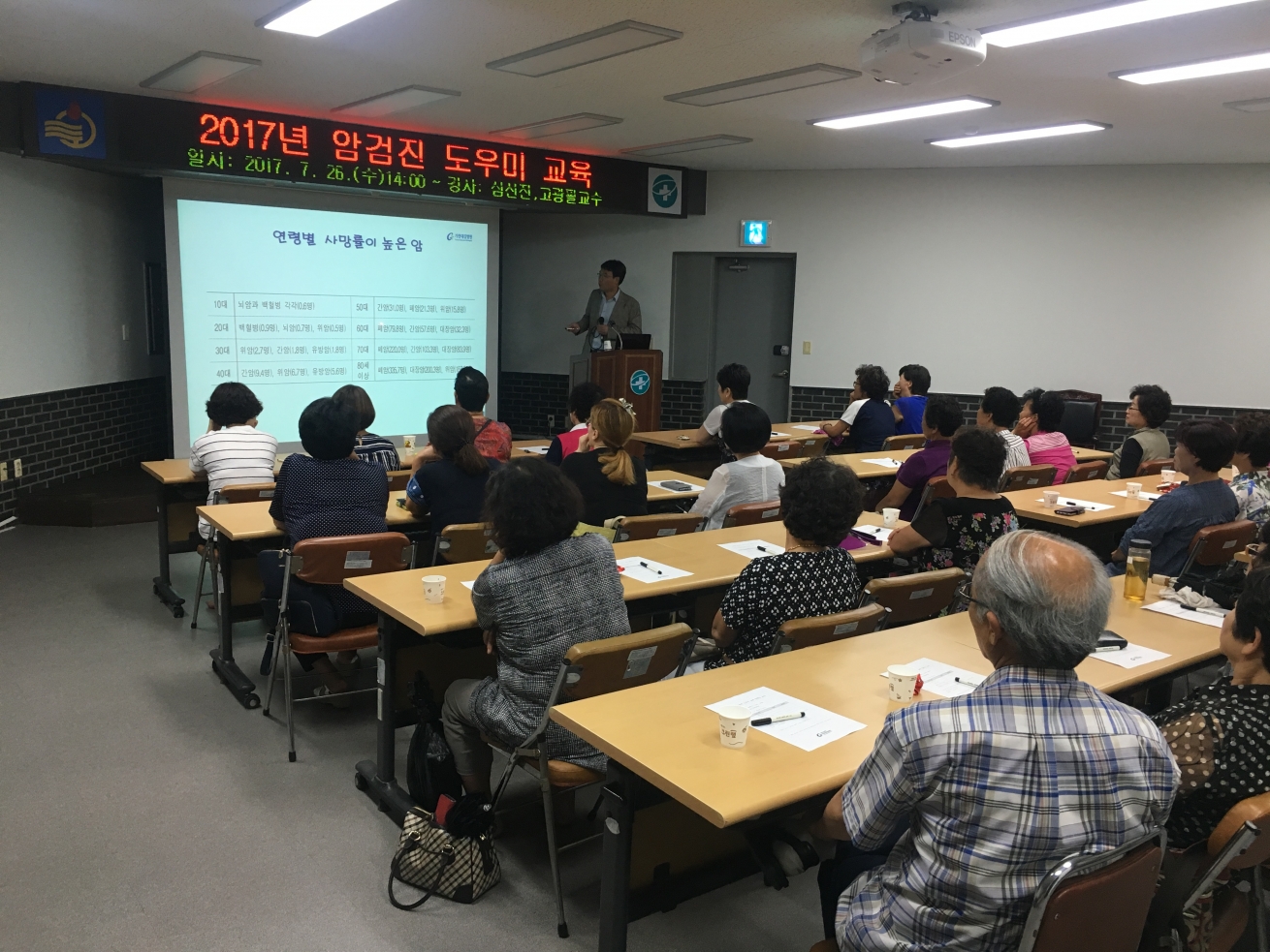 7. 26 (수) 강화군 보건소에서 강화군 암검진 도우미를 대상으로 가천대 길병원 혈액종양내과 심선진 교수가 대장암 치료 및