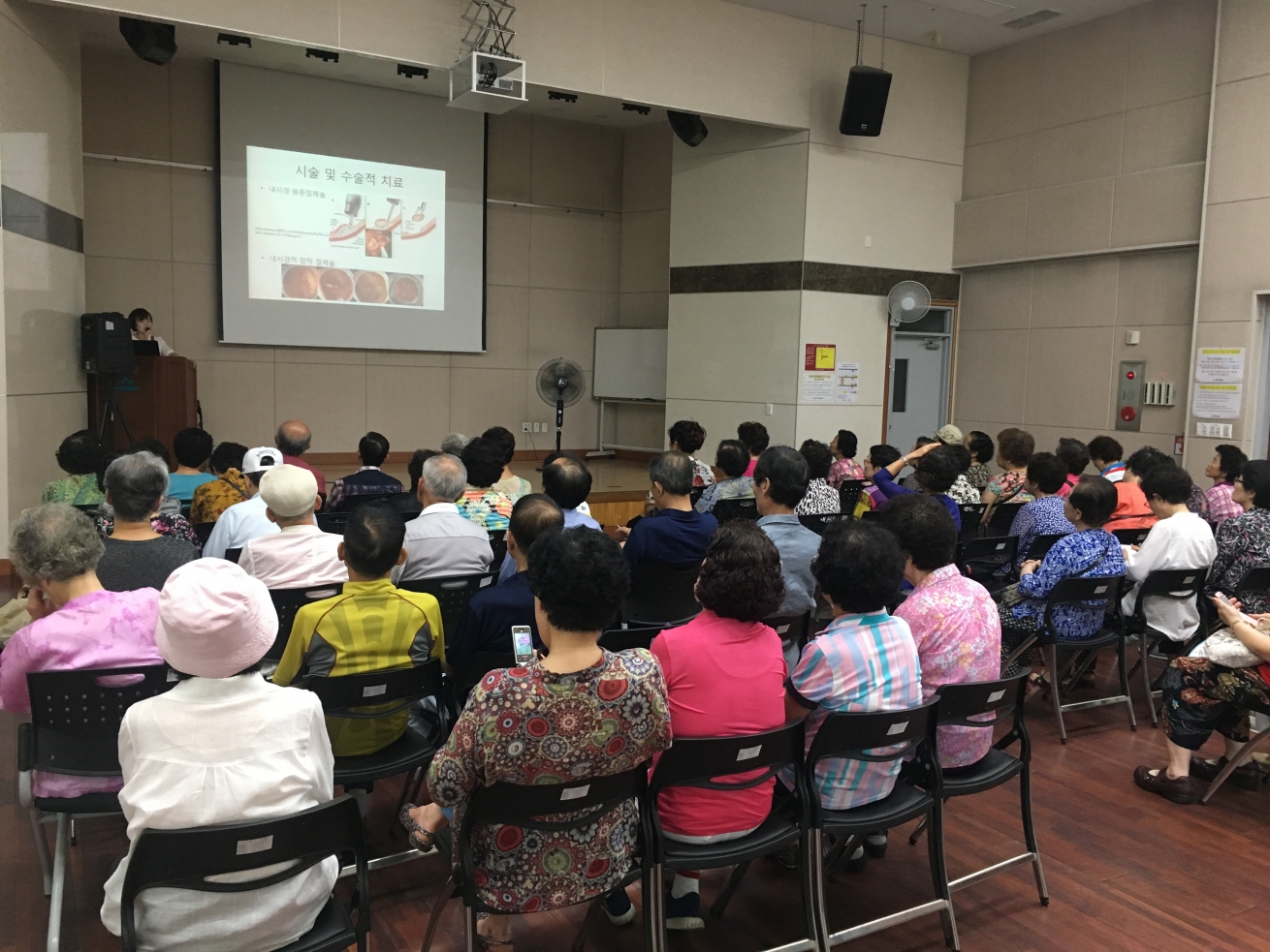 2017년 8월 22일 (화) 가천대 길병원 소화기내과 우현선 교수가 남구 주안노인문화센터에서 80여명을 대상으로 대장암 치료 및 예방관리,대장암 발생의 원인,암예방과 조기암검진의 중요성 등에 대해서 교육하였습니다.
