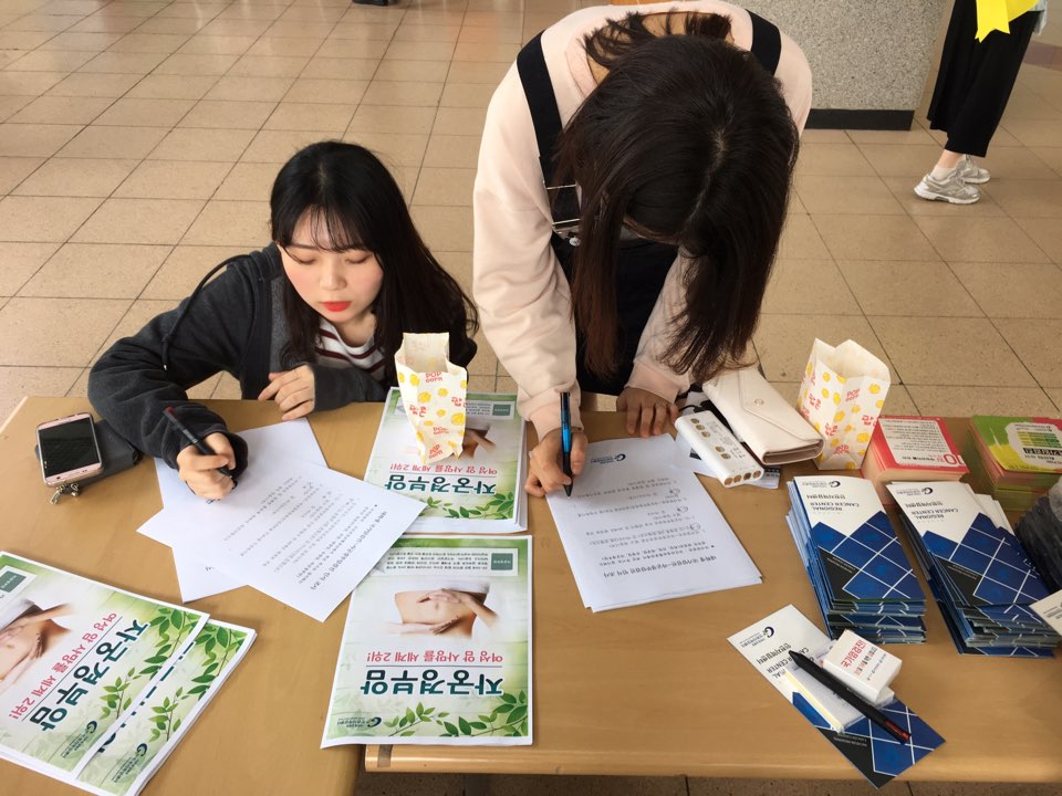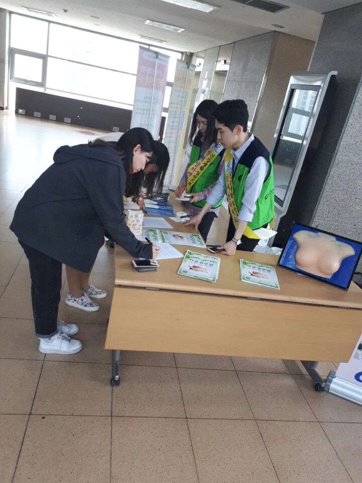2017년 5월 16일(화) 인천지역암센터 암 예방 서포터즈와 함께 재능대학교 에서 학생을 대상으로 자궁경부암 및 유방암 검진에 대해 홍보 캠페인을 실시하였습니다.