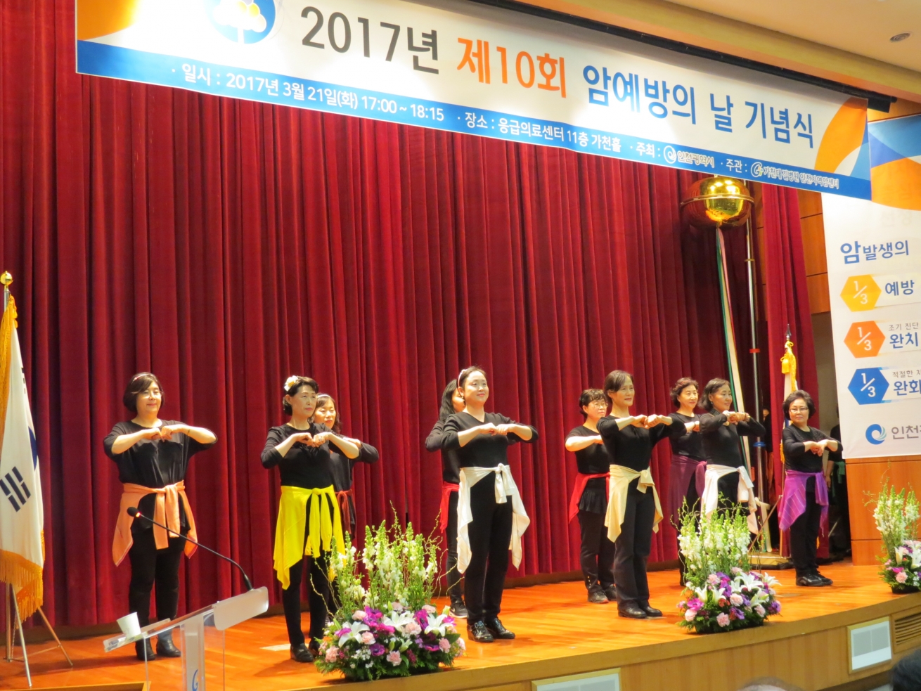 기념식은 국가암관리사업 유공자 포상, 기념사, 축사, 감사패 수여, 국민암예방 수칙낭독, 암예방 서포터즈 6기 발대식, 축하공연 순으로 진하였으며, 축하공연으로는 인천지역암센터 자조모임 '플러스'의 라인댄스를 진행하였습니다.