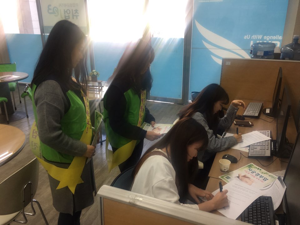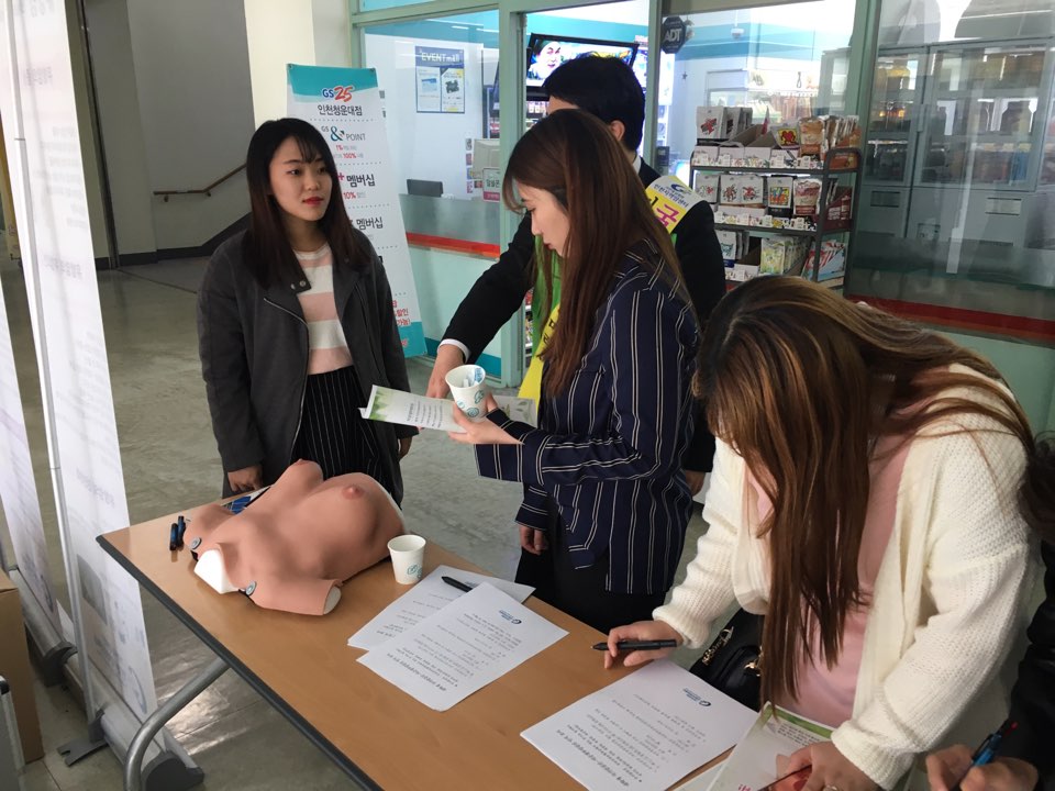2017년 4월 27일(목) 인천지역암센터 암 예방 서포터즈와 함께 청운대학교 인천캠퍼스 에서 학생을 대상으로 자궁경부암 및 유방암 검진에 대해 홍보 캠페인을 실시하였습니다.