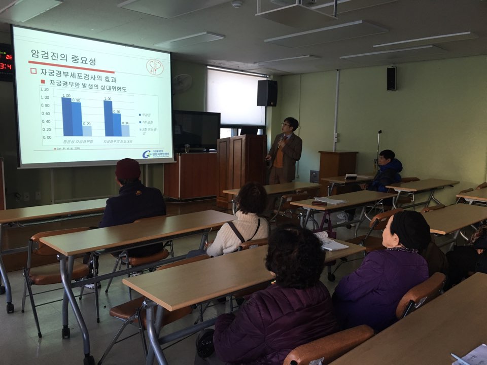 11월 28일(월) 15시 인천중구노인복지관에서 지역주민 30여명을 대상으로 가천대학교 예방의학 임준 교수가 암예방과 검진에대해 교육을