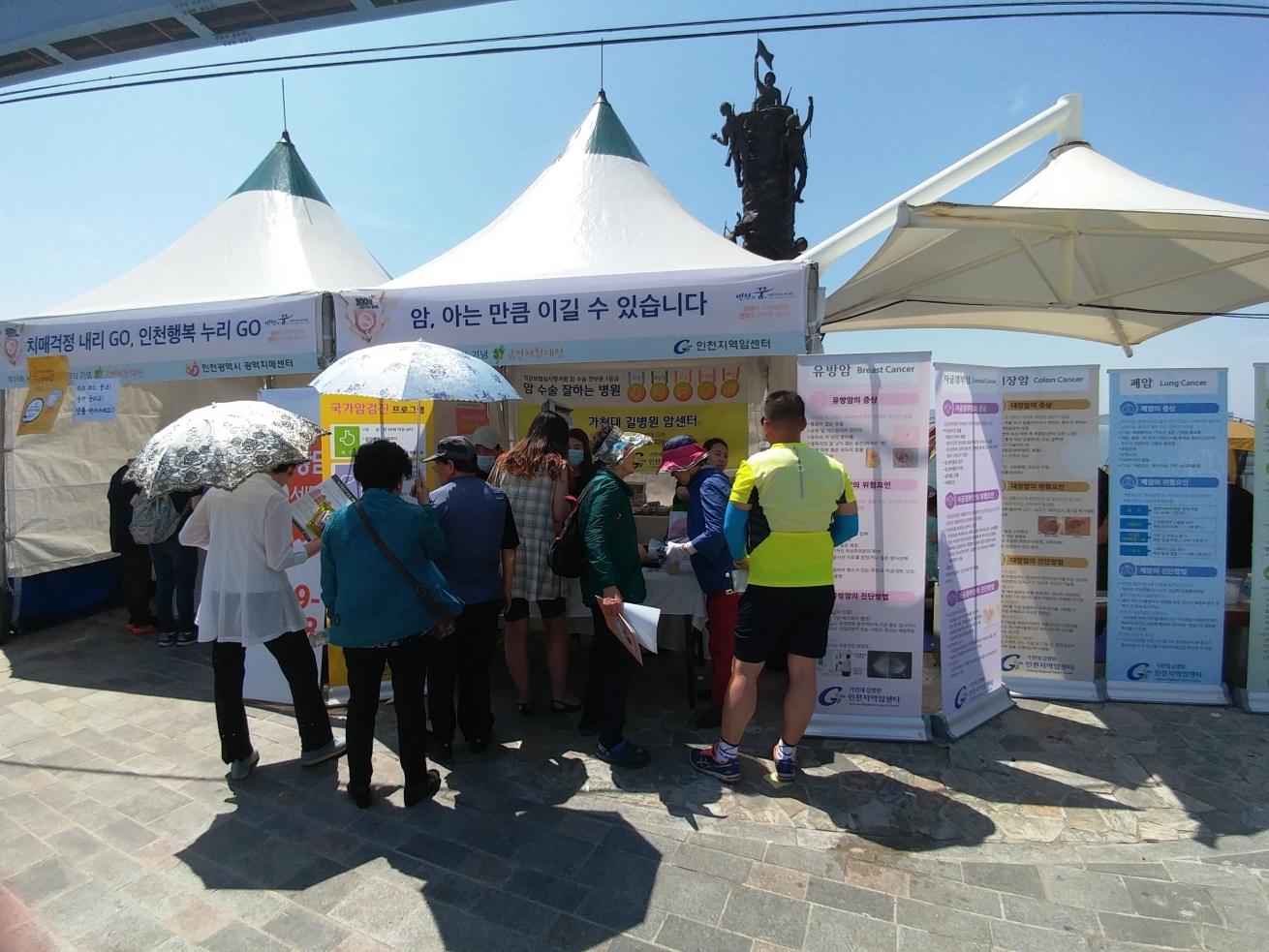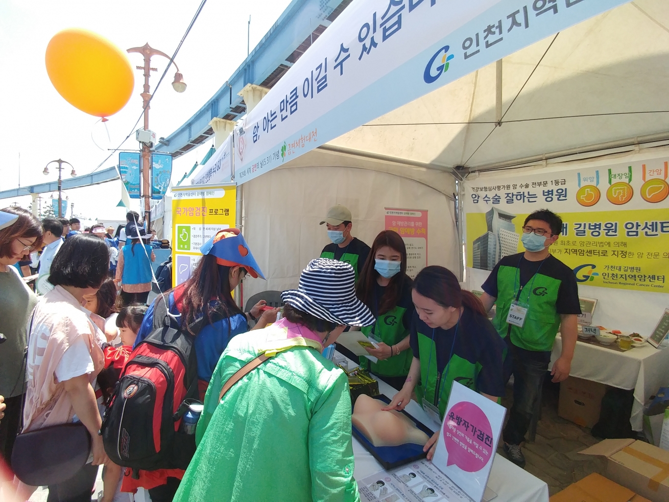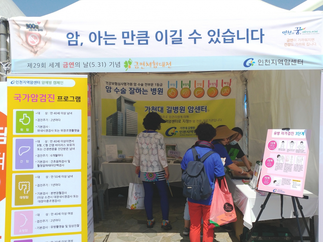 인천지역암센터는 행사에 참여한 많은 시민들에게 유방자가검진법을 알려드리고 국민암예방수칙과 관련한 OX퀴즈를 진행하여 소정의 기념품을 드렸습니다.