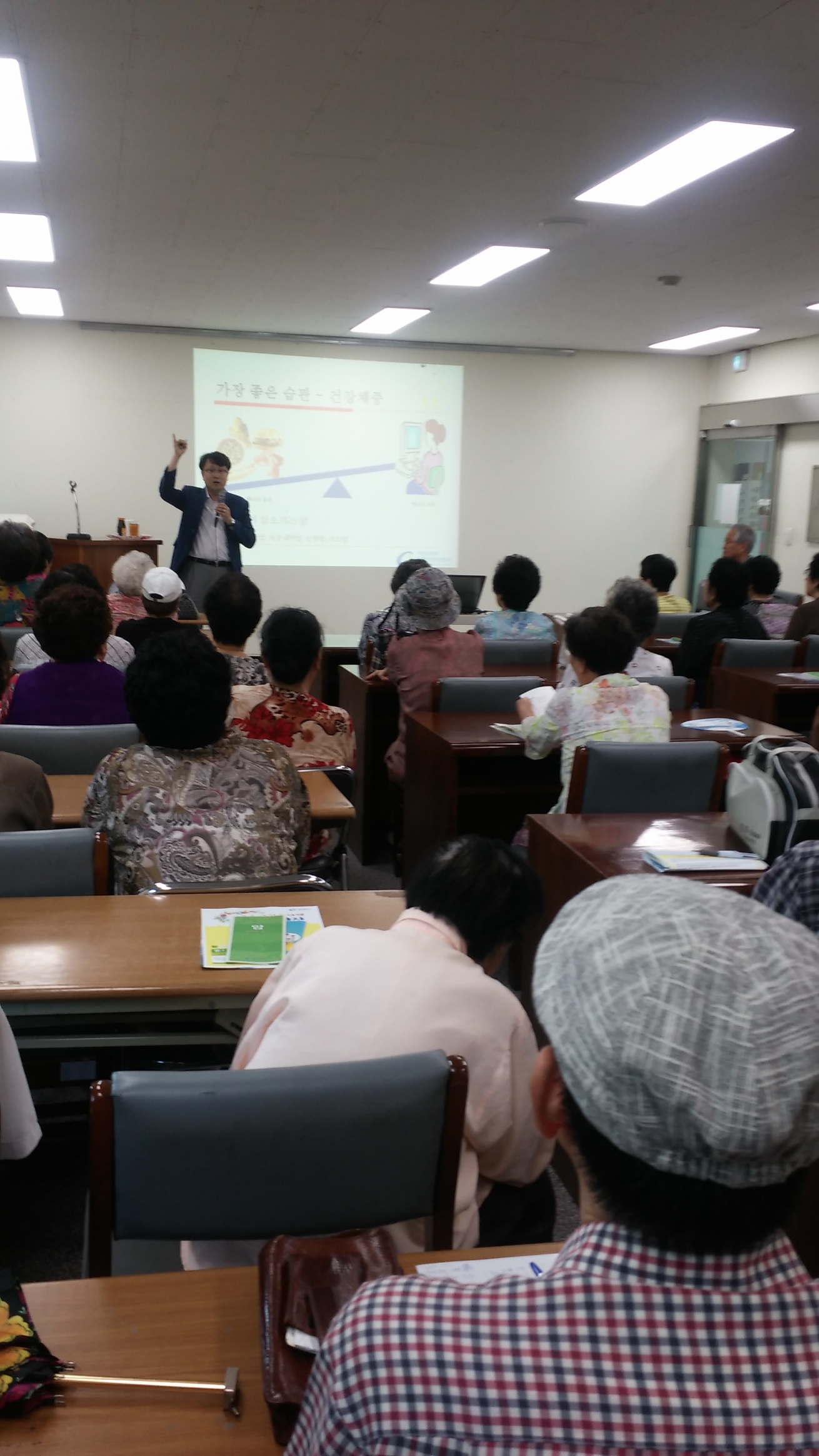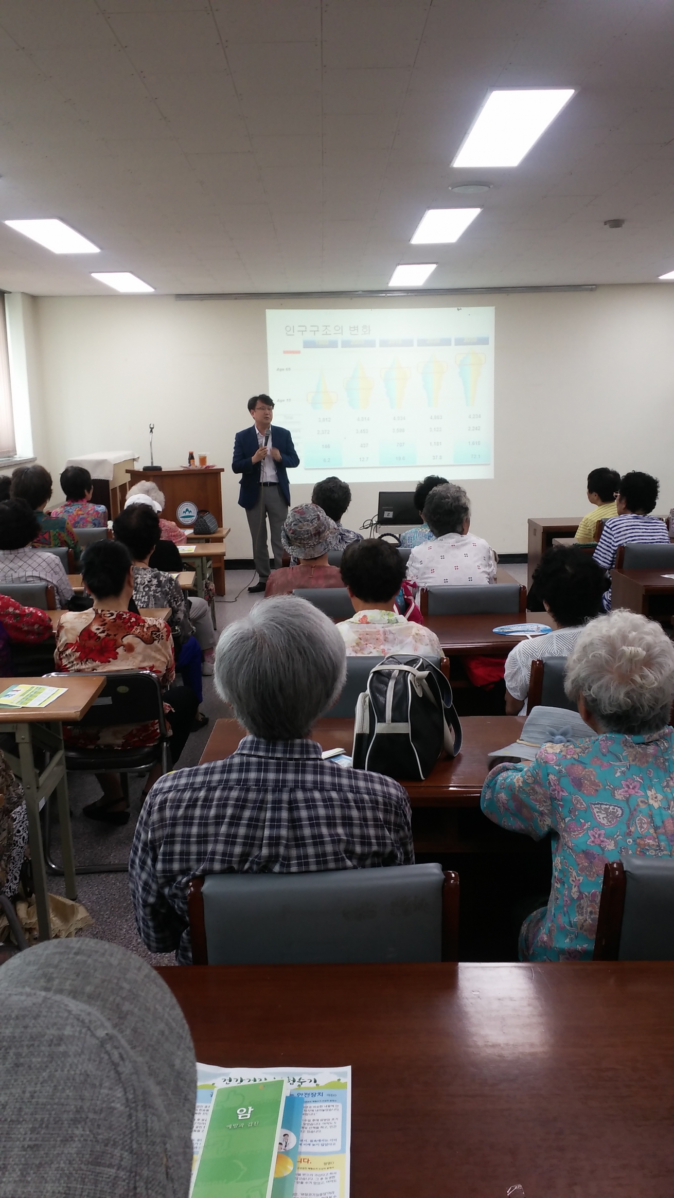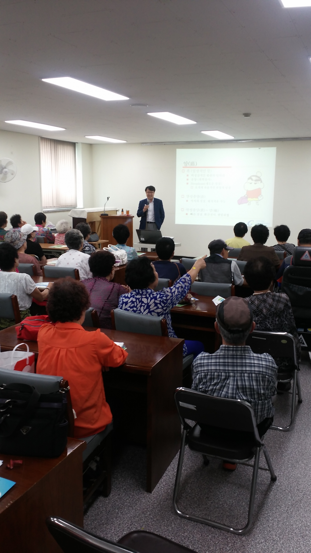 이용하시는 어르신들 50여명을 대상으로 암 예방과 검진에 대한 강의를 하였습니다.