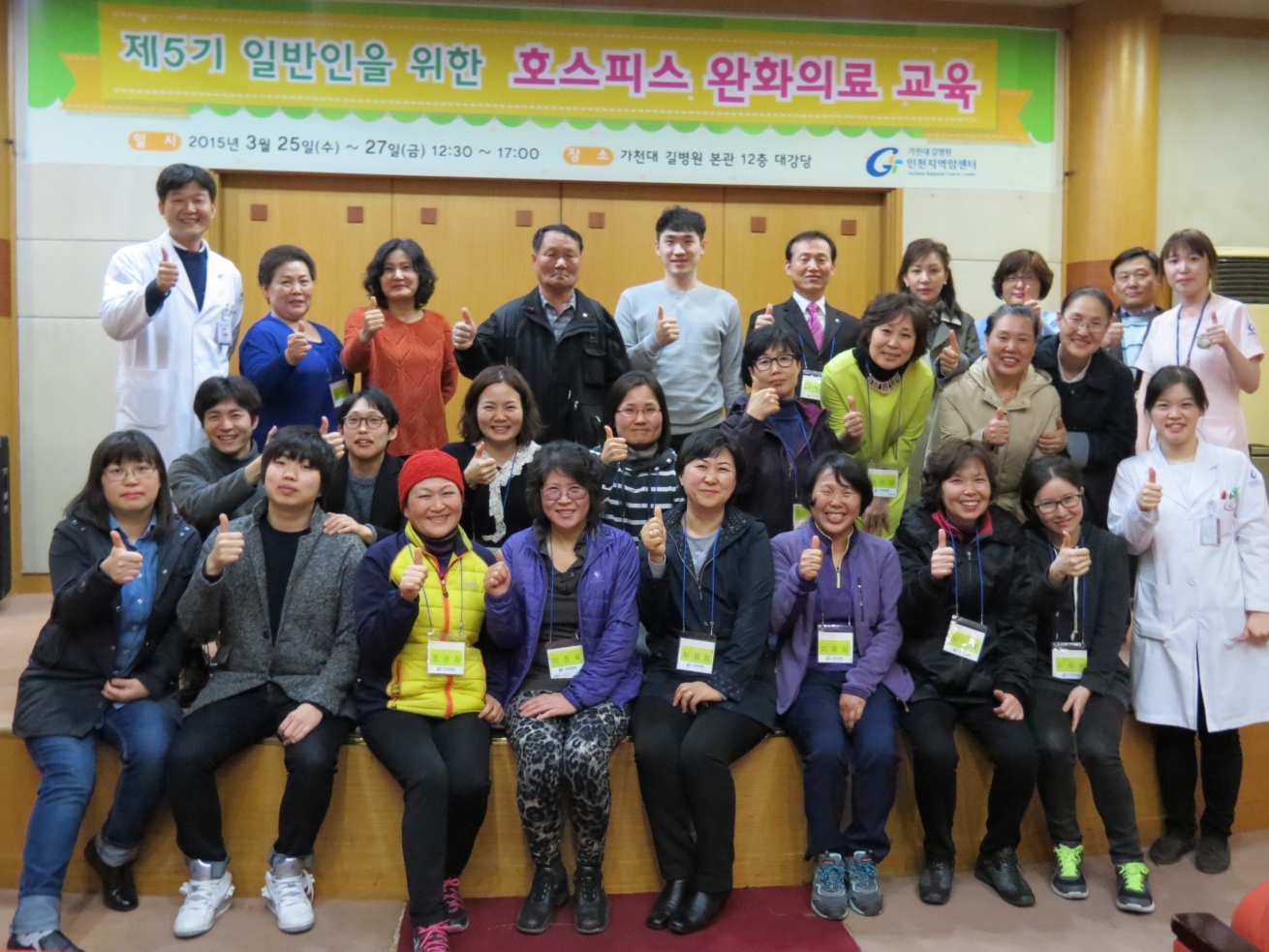 3월 25일(수)부터 27일(금)까지 총 3일간 제5회 일반인을 위한 호스피스 완화의료 교육 실시했습니다. 이번 교육은 호스피스 완화의료 자원봉사자를 자체 양성하기 위한 호스피스완화의료의 이해, 말기암환자의 돌봄, 의사소통, 아로마 림프마사지 실습 등 11시간 의 강좌로 이루어졌고, 교육을 수료한 22명의 교육생은 가천대 길병원 완화의료병동에서 자원봉사를 할 수 있는 자격이 주어 졌습니다.