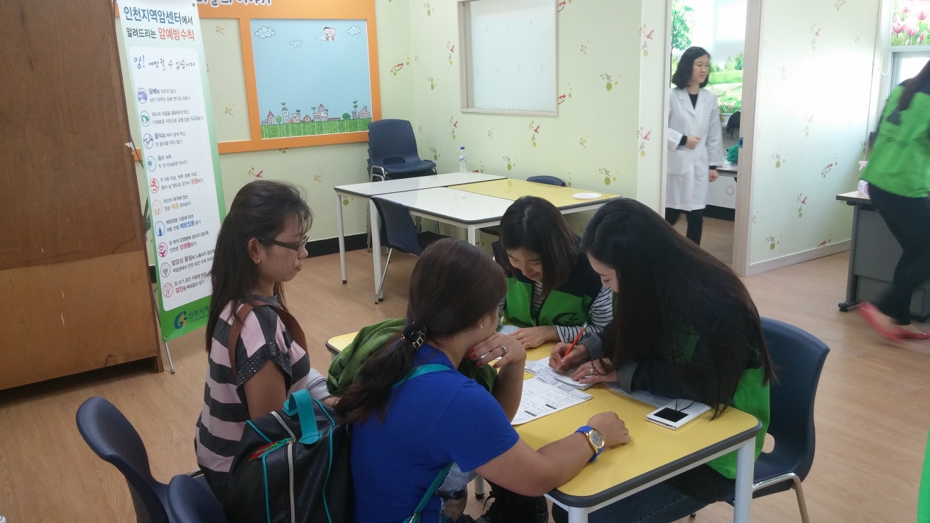 2014년 10월 26일(일) 인천 부개초등학교에서 외국인 여성 이주노동자들을 대상으로 무료 자궁암 검진 활동을 실시하였습니다.