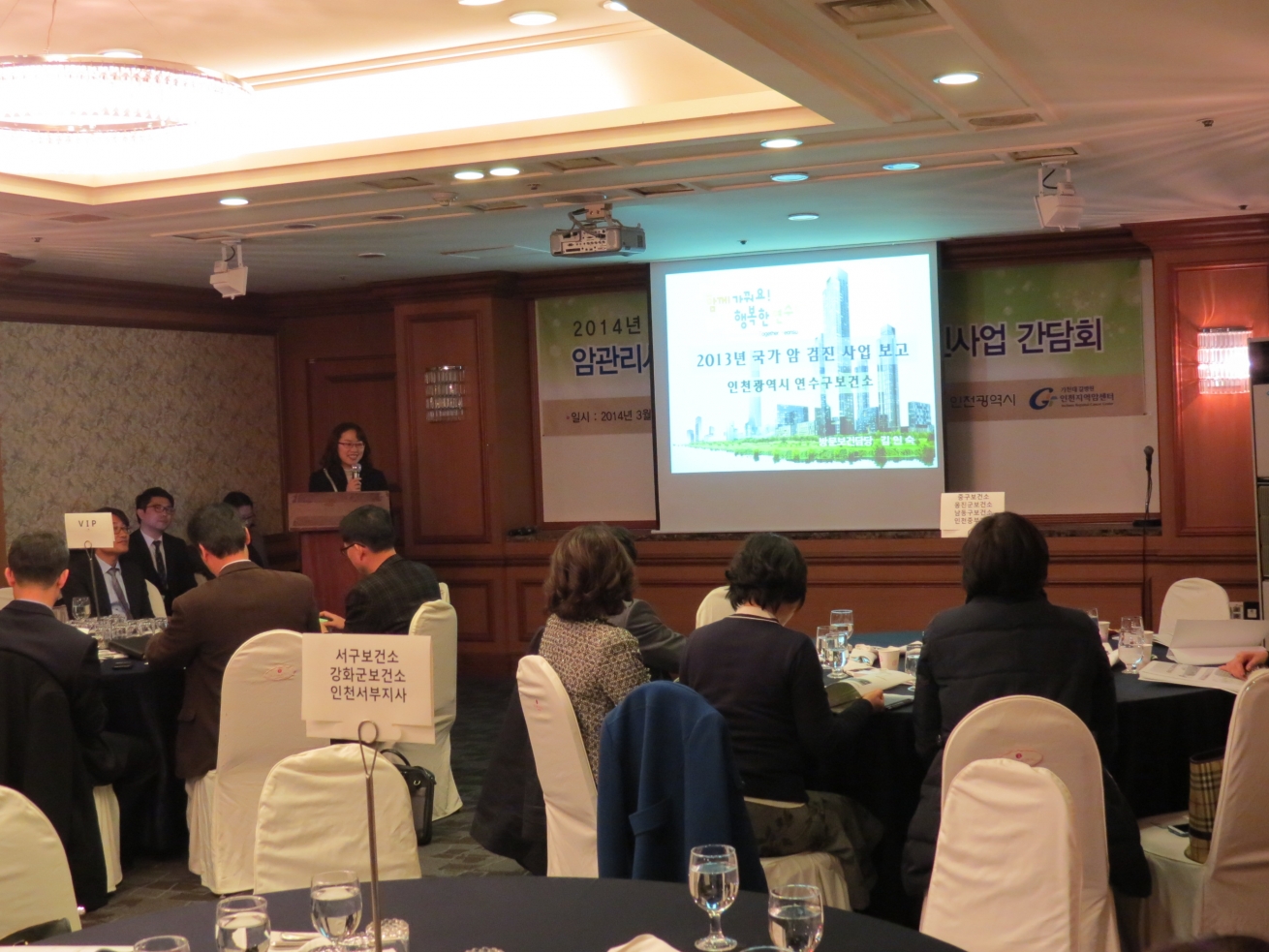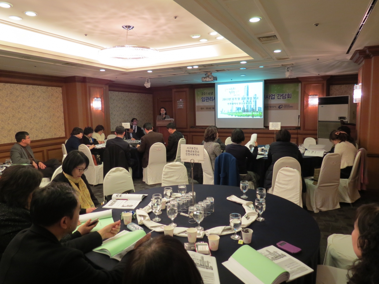 2014년 3월 5일 라마다송도호텔에서 인천광역시청, 인천광역시 10개 군구 보건소, 국민건강보험공단 경인지역본부 및 6개 인천지사 국가암관리사업 담당자들과 함께 2014년 암관리사업 설명회 및 국가암검진사업 간담회를 개최하였습니다.