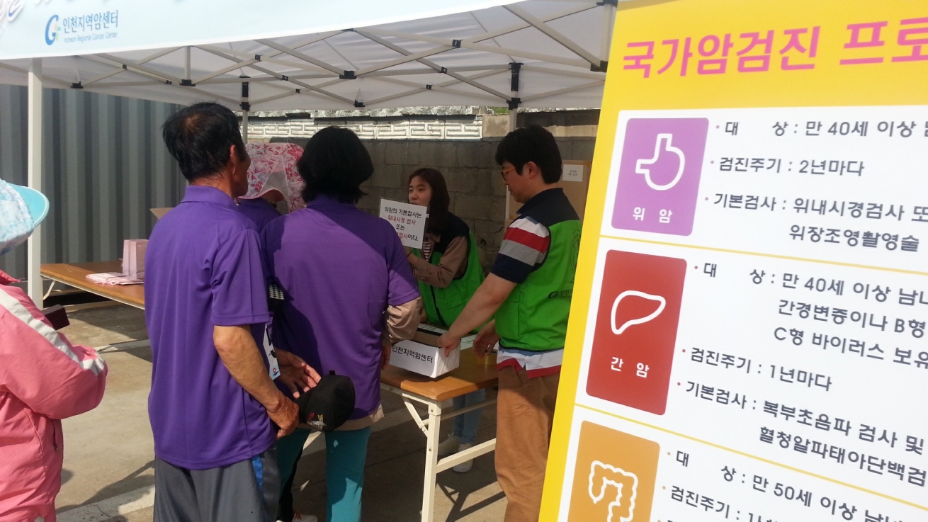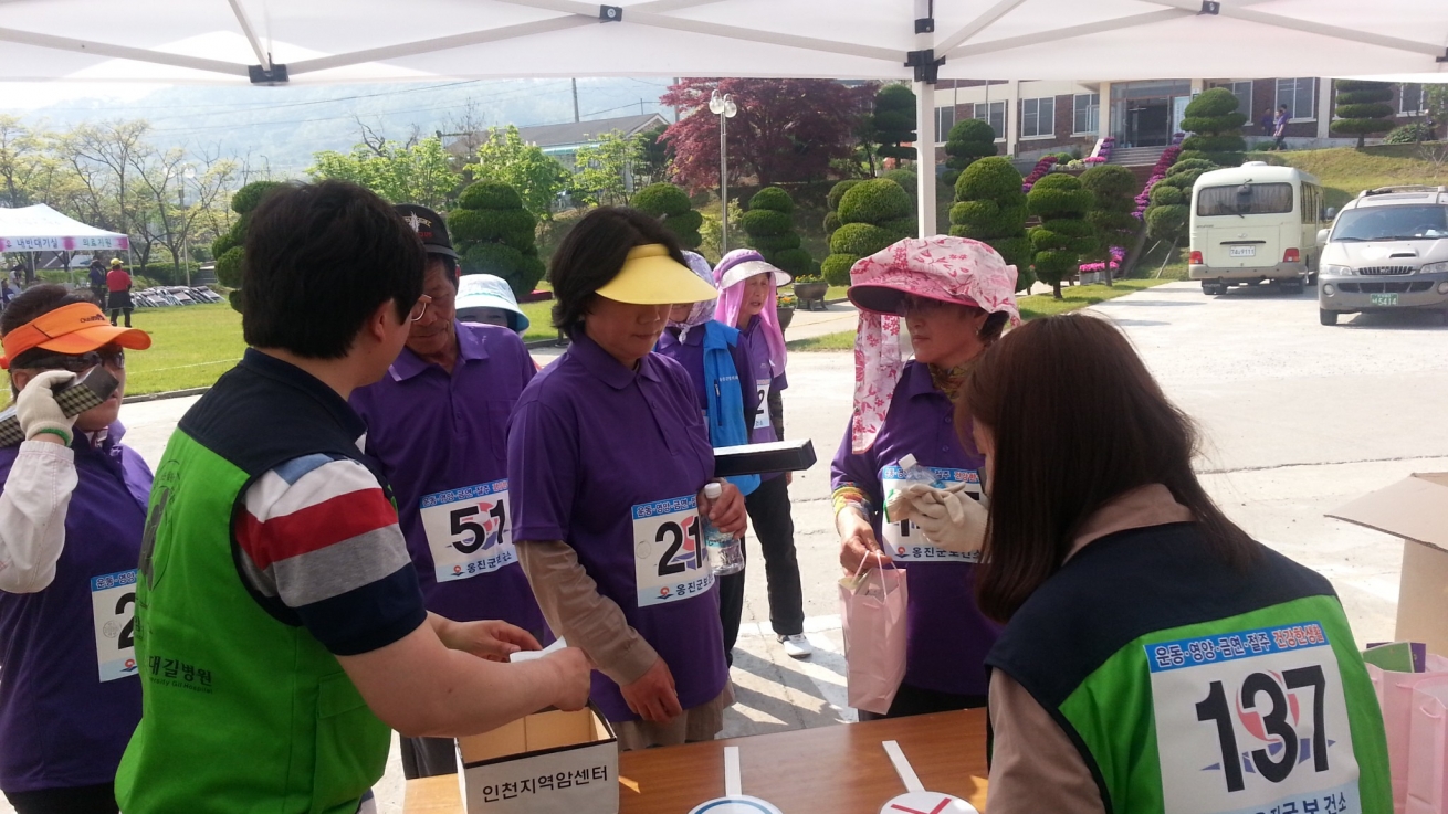 인천지역암센터는 5월 23일 자월면 건강걷기대회에 참여하는 인천시민들을 대상으로 암예방과 검진의 중요성에 대해 홍보하였습니다.