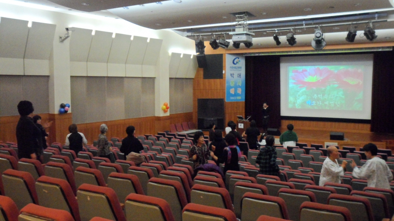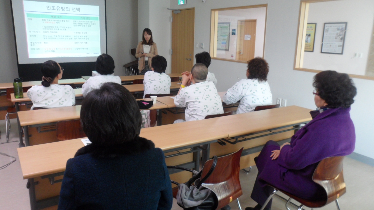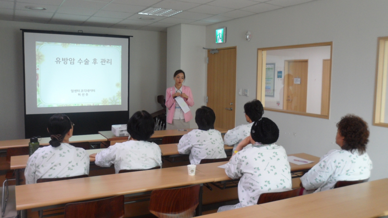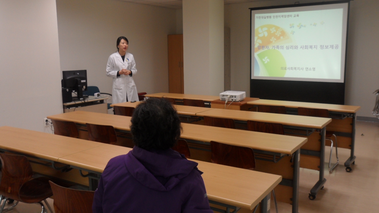 저희 인천지역암센터 18층 교육실에서는 암환자와 가족을 위한 노래교실, 림프부종관리, 사회복지안내, 아트테라피, 외모관리, 운동교실, 웃음요법, 음악치료, 쿠킹테라피 등 매월 다양한 프로그램을 준비하여 실시하고 있습니다.