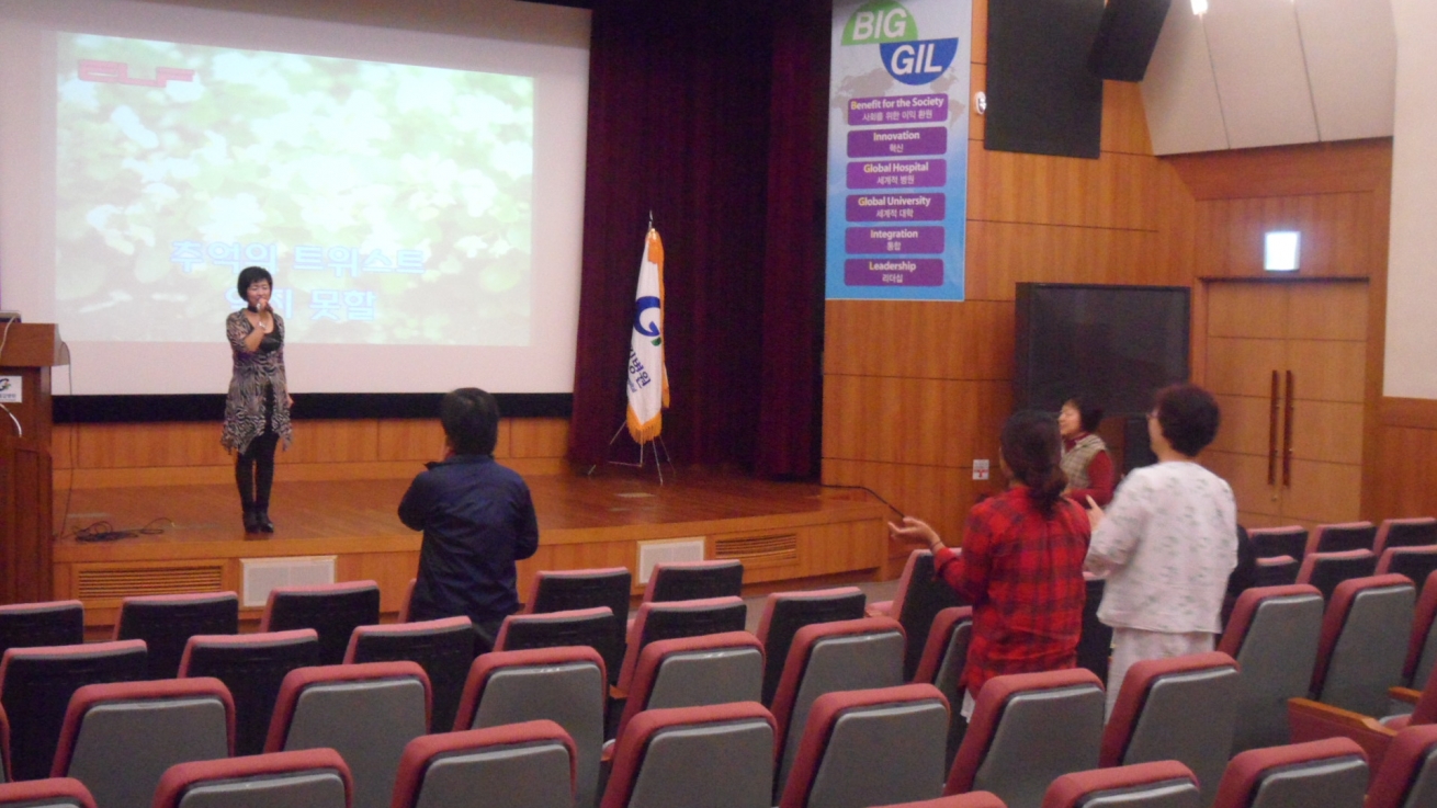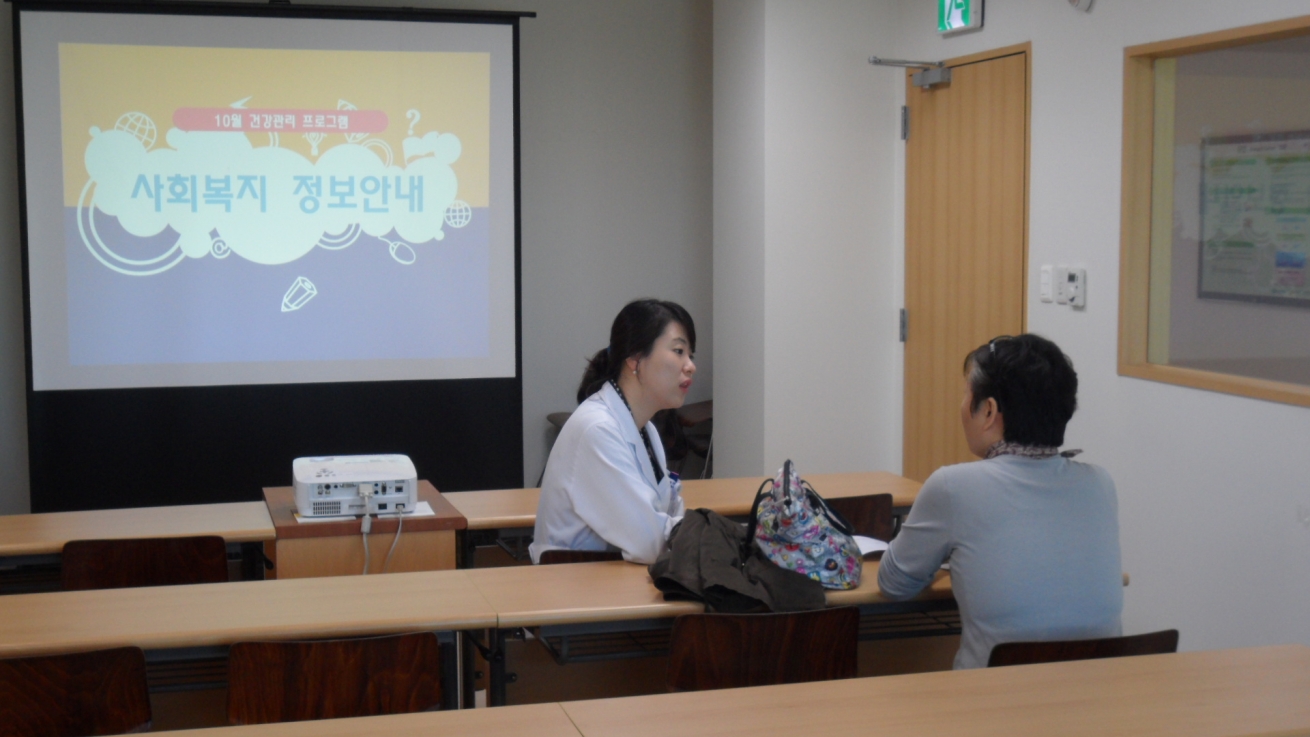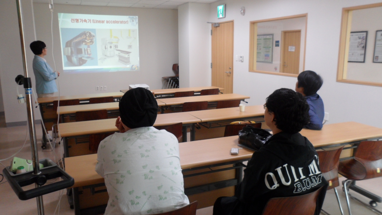 저희 인천지역암센터 18층 교육실에서는 암환자와 가족을 위한 노래교실, 마인드테라피, 방사선치료중관리, 부부생활교육, 사회복지정보안내, 아트테라피, 암환자영양관리, 여성환우를위한외모관리, 운동교실, 유방암환자관리와림프종예방법, 음악치료, 지압과마사지, 쿠킹테라피 등 매월 다양한 프로그램을 준비하여 실시하고 있습니다.