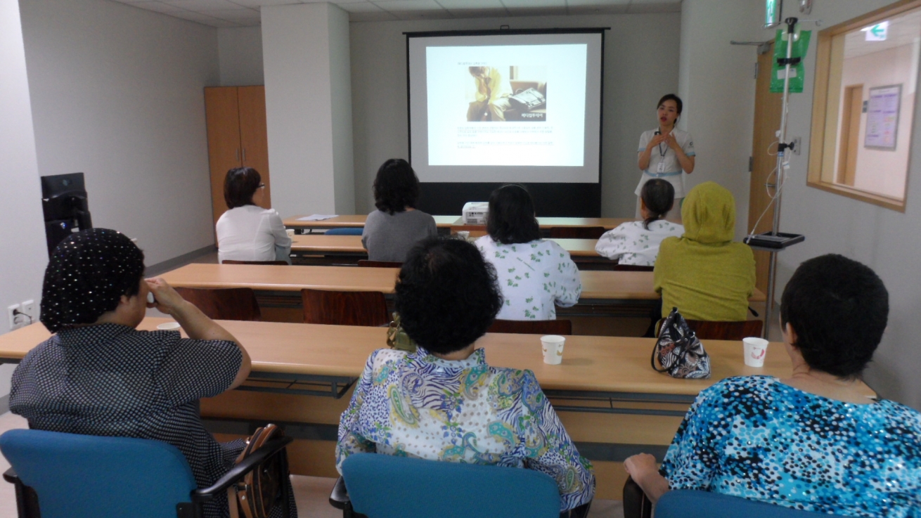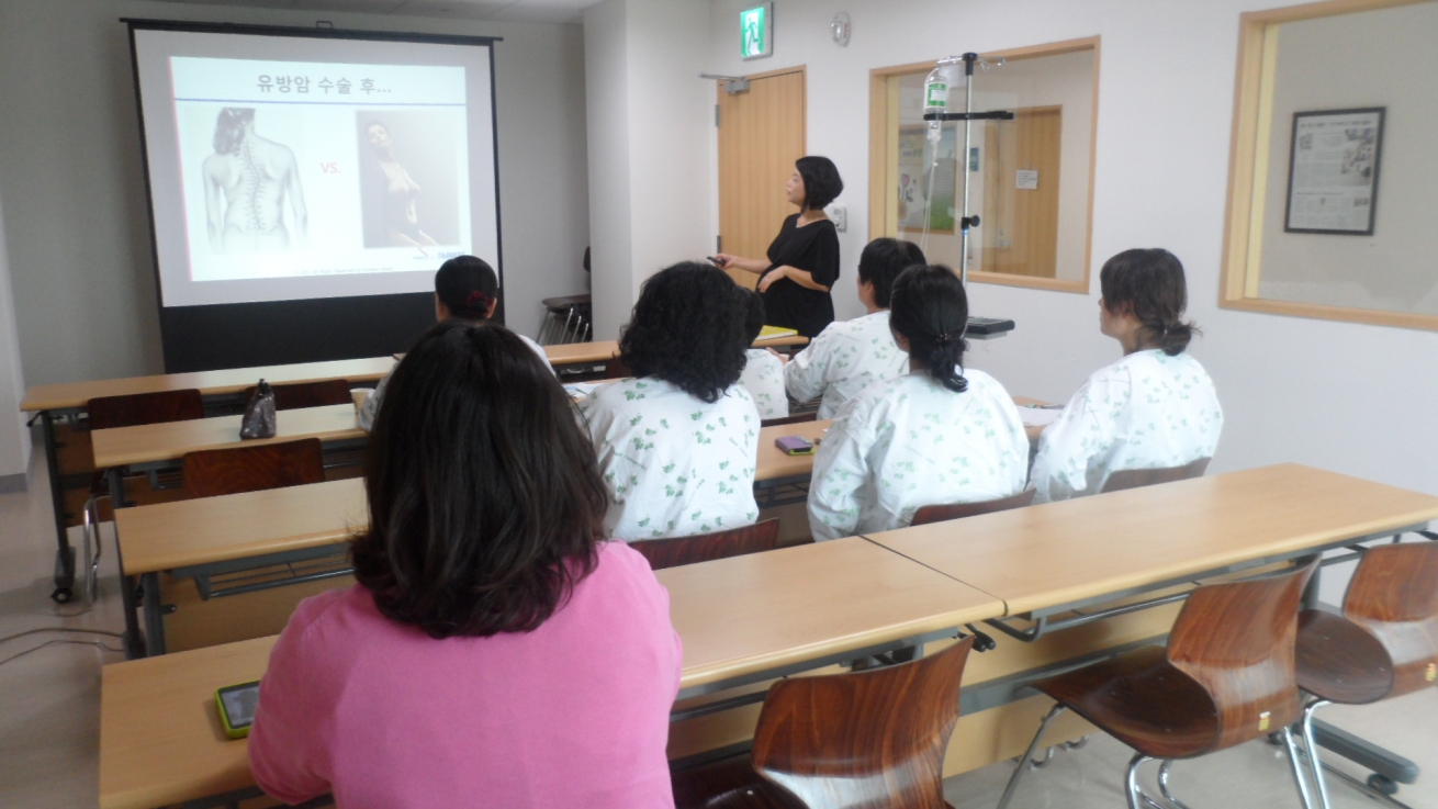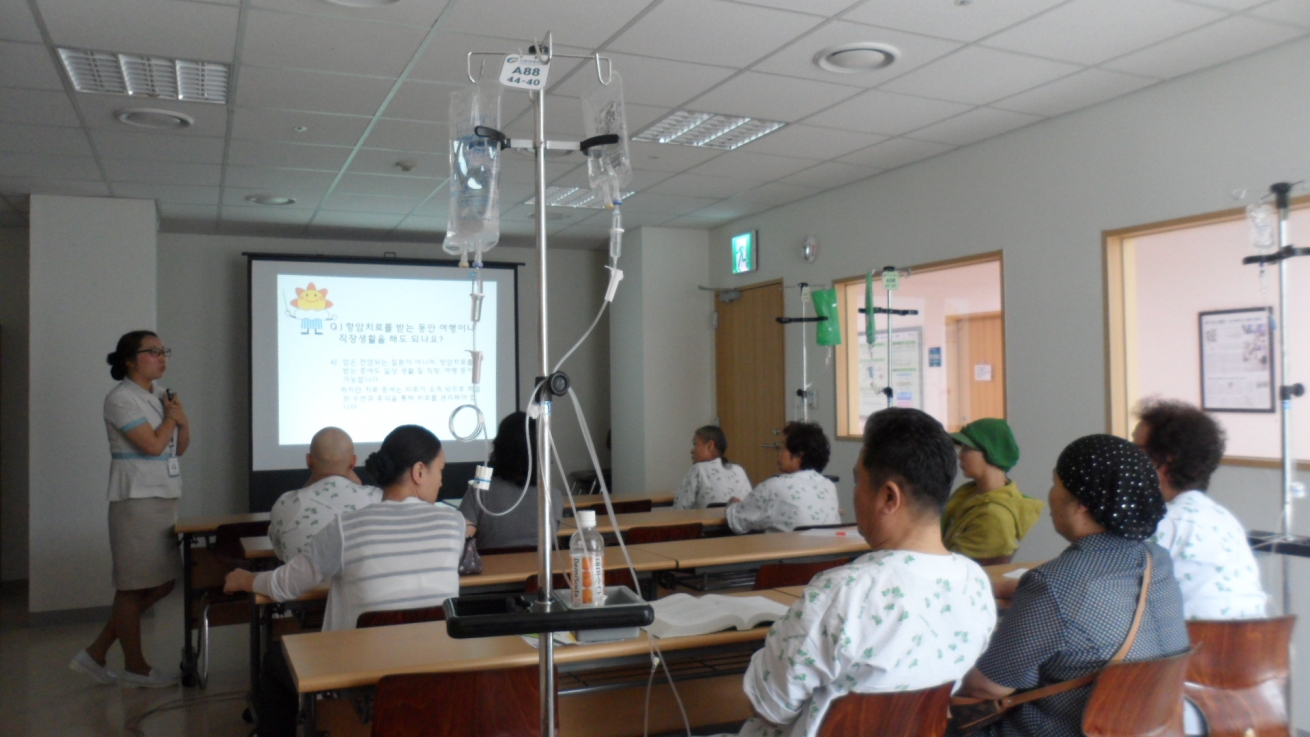 저희 인천지역암센터 18층 교육실에서는 암환자와 가족을 위한 여성환우외모관리, 지압과 마사지, 피로관리, 항암제 부작용 교육, 운동 교실, 웃음요법, 노래교실, 방사선 치료중 관리, 아트테라피, 암환자 영양관리 등 매월 다양한 프로그램을 준비하여 실시하고 있습니다.