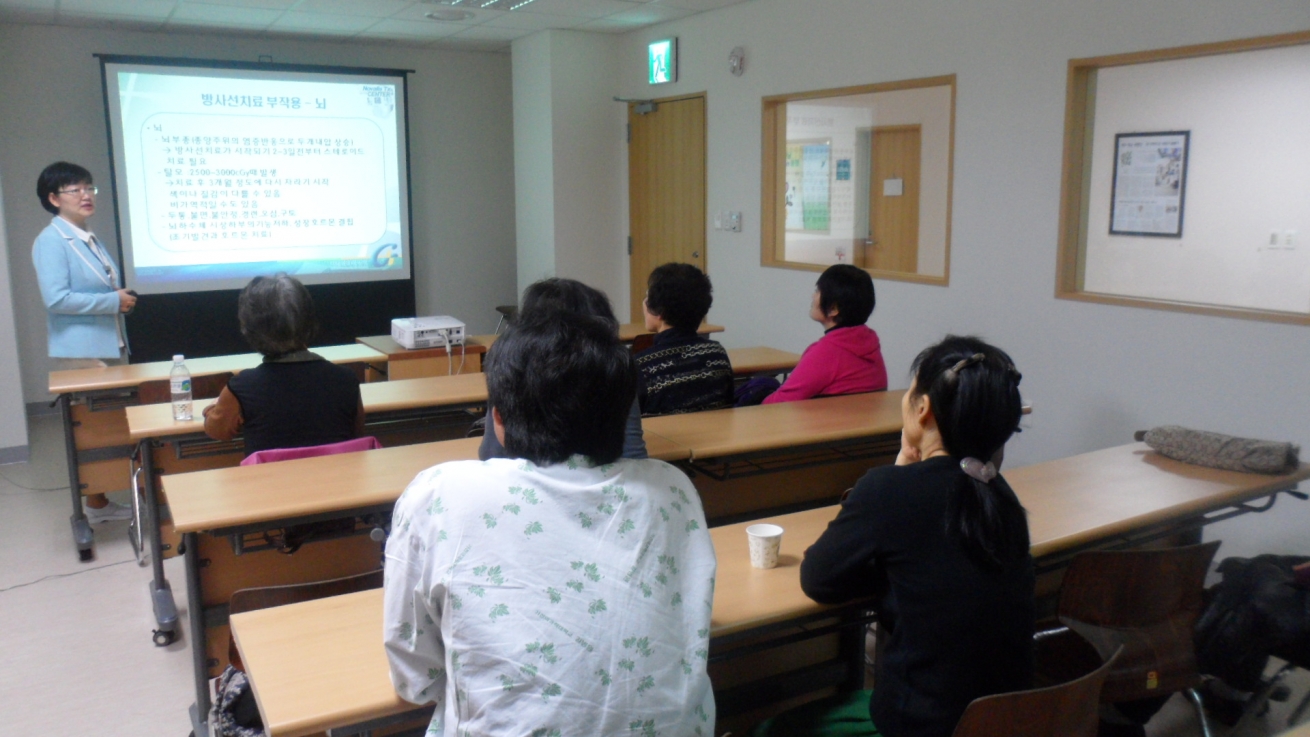 암센터 18층 교육실에서 암환자와 가족을 위한 방사선 치료후 관리 교육을 실시하였습니다.