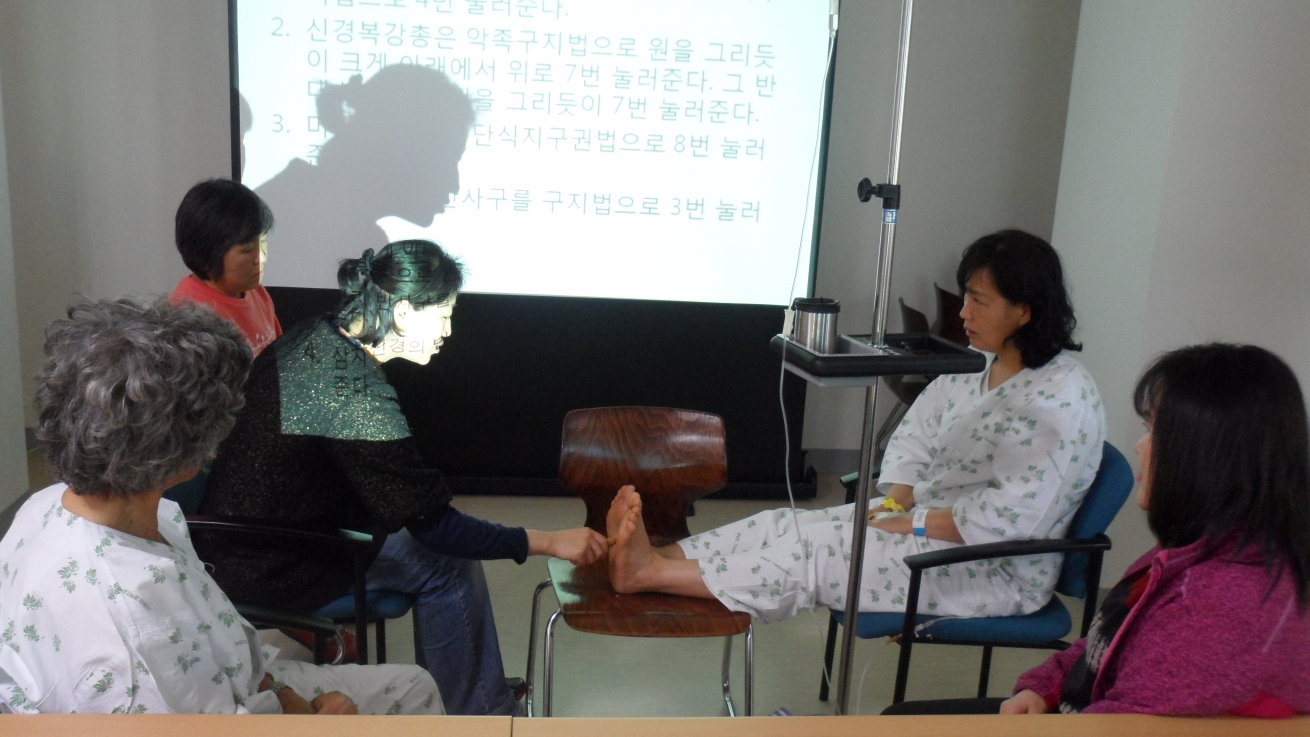 암센터 18층 교육실에서 암환자와 가족을 위한 지압과 마사지 교육을 실시하였습니다.