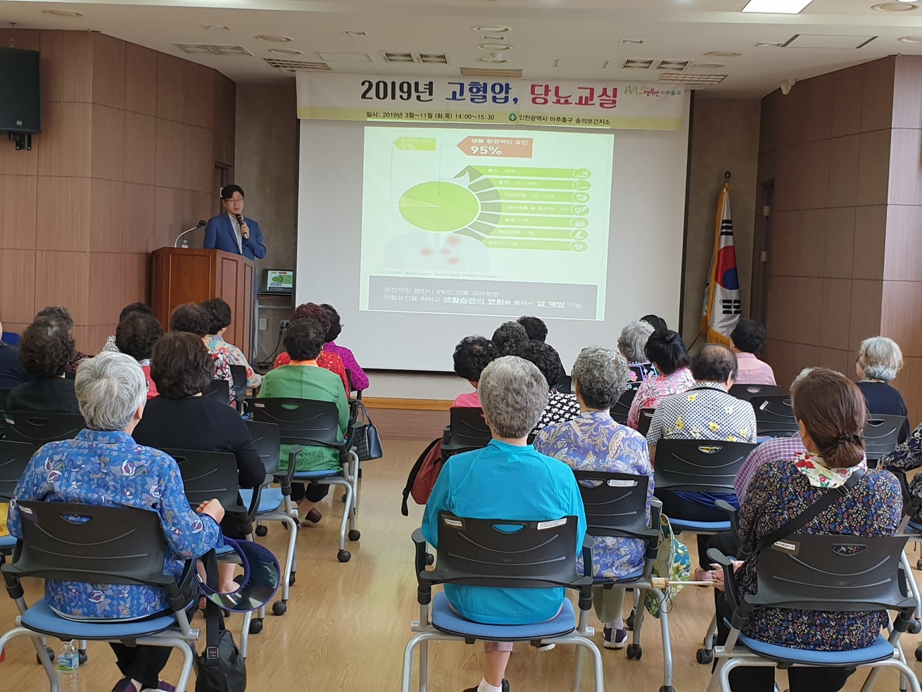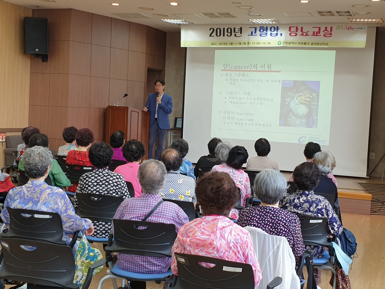 | 2019년 6월 4일 미추홀구 지역주민을 대상으로 숭의보건지소에서 암 예방과 관리에 대해 가천대학교 예방의학과 고광필 교수가 교육을 실시 하였습니다. |