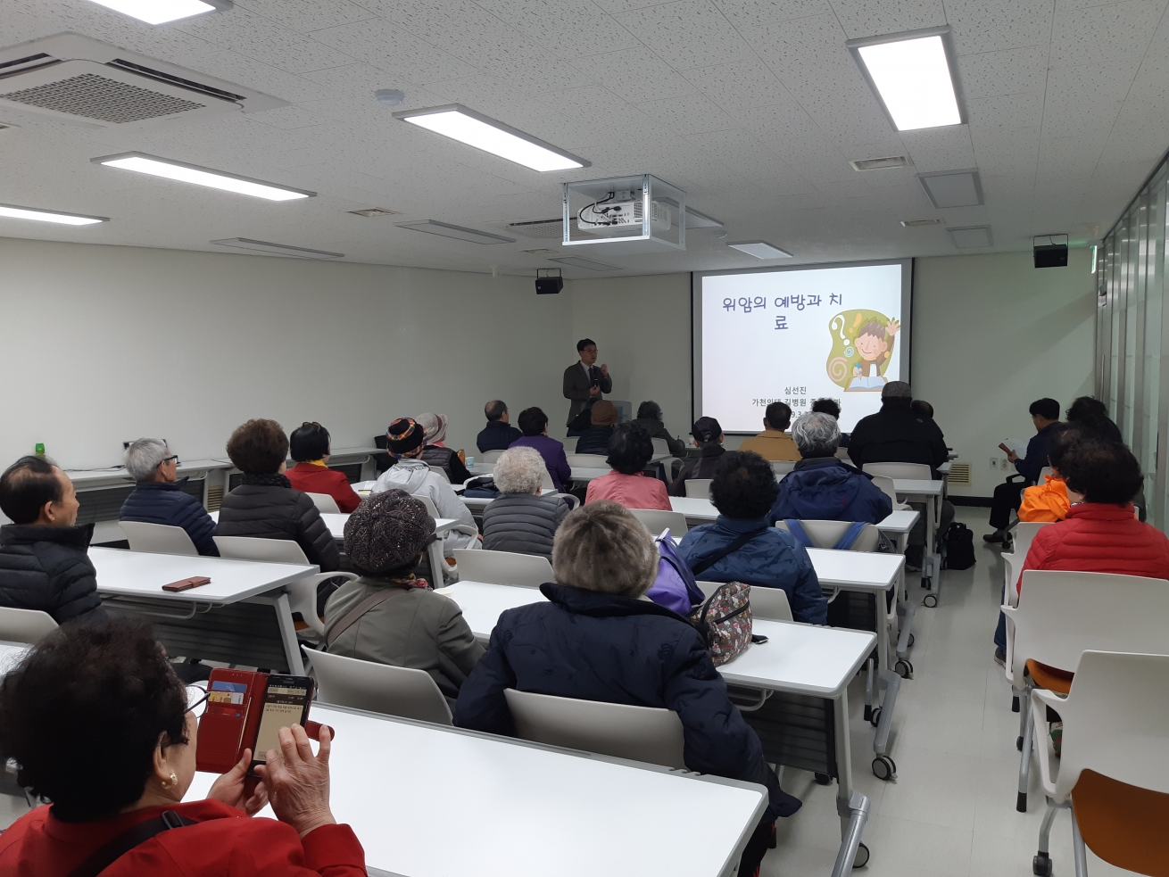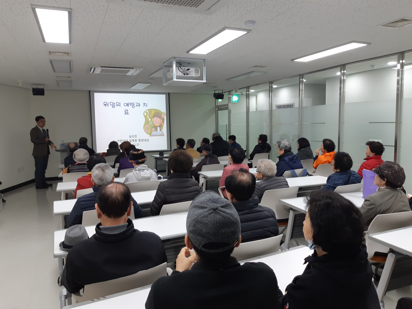 2019년 3월 27일 서구 지역주민을 대상으로 검단건강생활지원센터에서 위암 치료 및 예방관리에 대해 가천대 길병원 종양내과 심선진 교수가 교육을 실시 하였습니다.