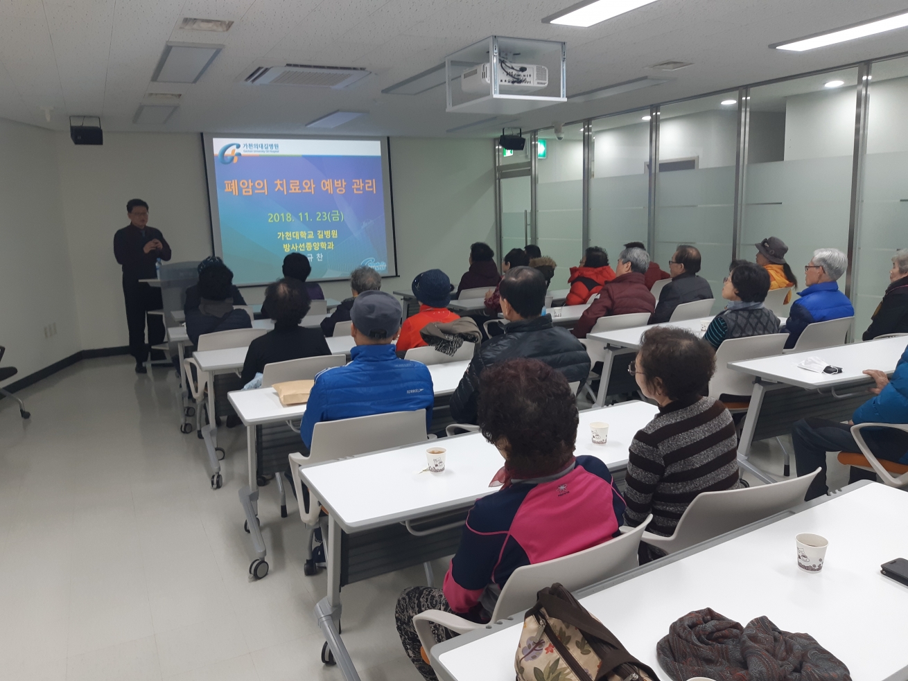 2018년 11월 23일 서구 지역주민을 대상으로 검단건강생활지원센터에서 폐암 치료 및 예방관리에 대해 가천대 길병원 방사선종양학과 이규찬 교수가 교육을 실시 하였습니다.