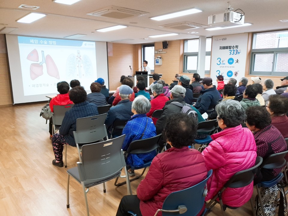 2019년 3월 12일 미추홀구 지역주민을 대상으로 간석건강관리센터에서 폐암 치료 및 예방관리에 대해 가천대 길병원 흉부외과 김건우 교수가 교육을 실시 하였습니다.