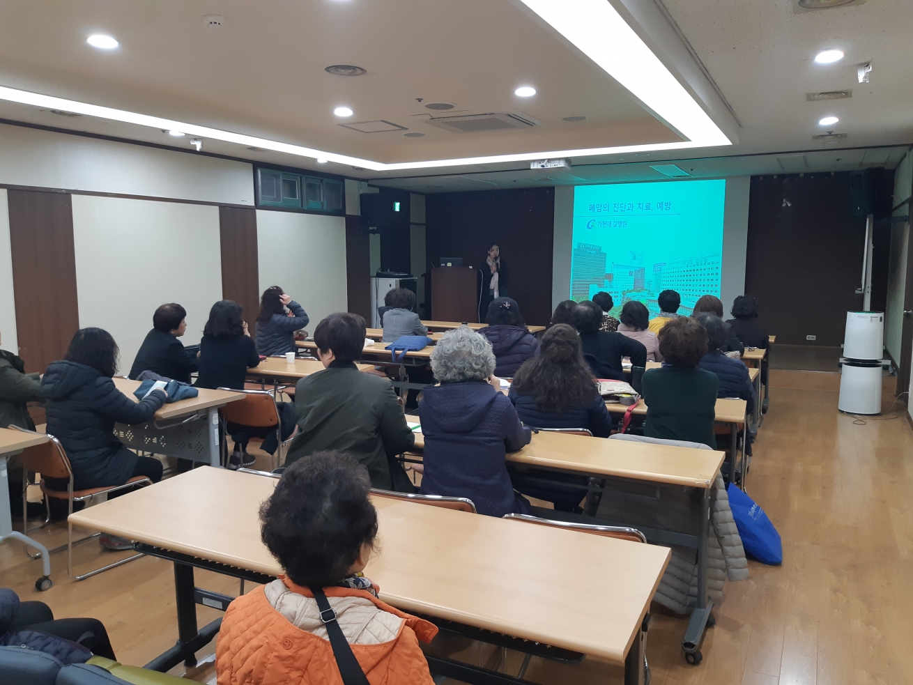 2019년 3월 14일 계양구 지역주민을 대상으로 계양구보건소에서 폐암 치료 및 예방관리에 대해 가천대 길병원 종양내과 안희경 교수가 교육을 실시 하였습니다.