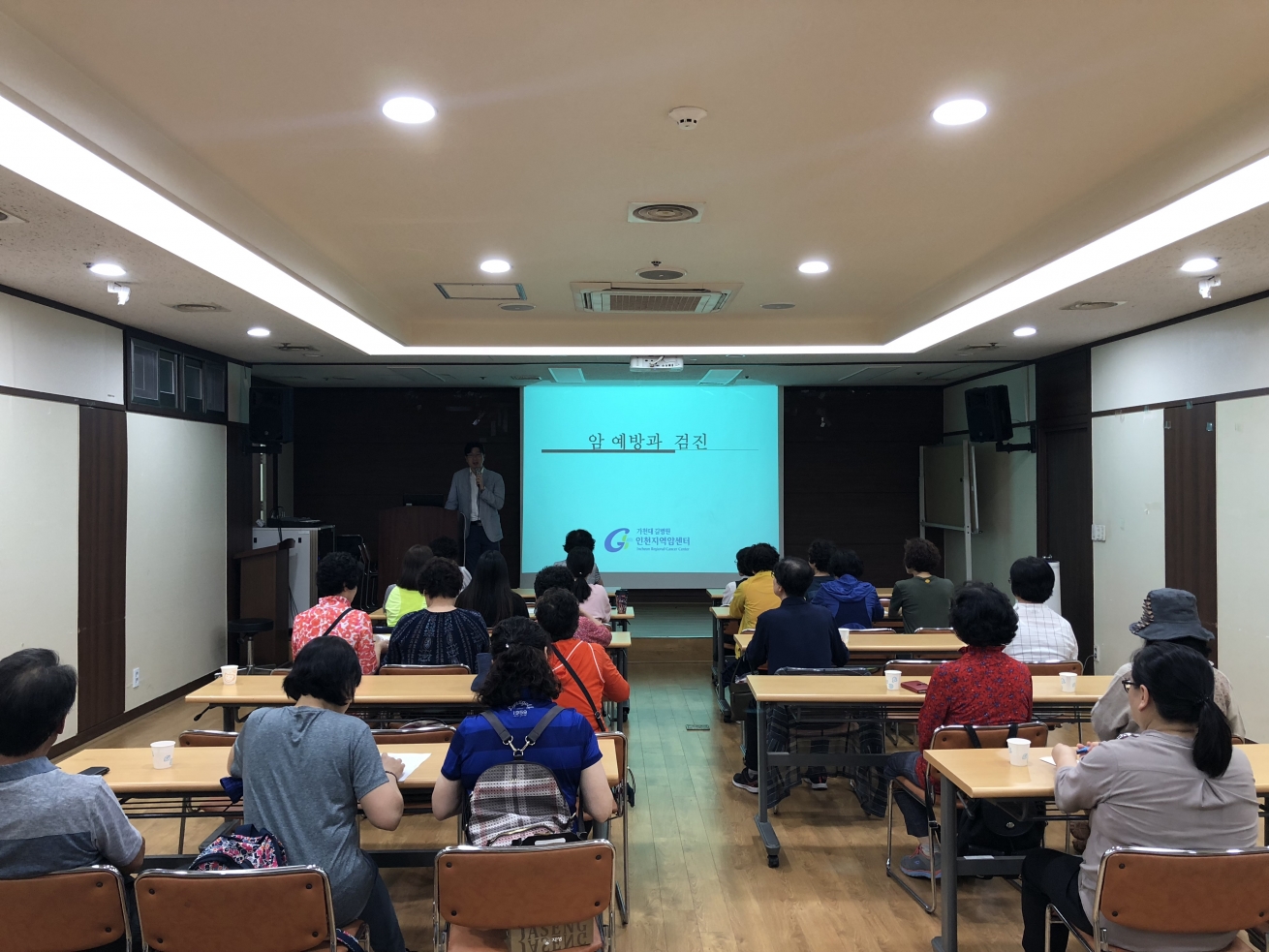 2018년 5월 31일(목) 계양구 지역주민을 대상으로 계양구보건소 에서 암 예방 및 국가 암 검진에 대해 가천대학교 예방의학과 고광필 교수가 교육을 실시하였습니다.